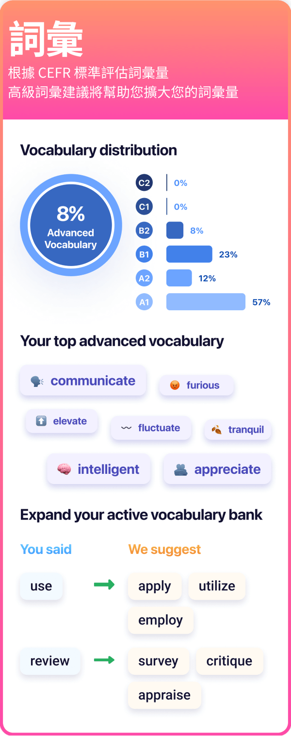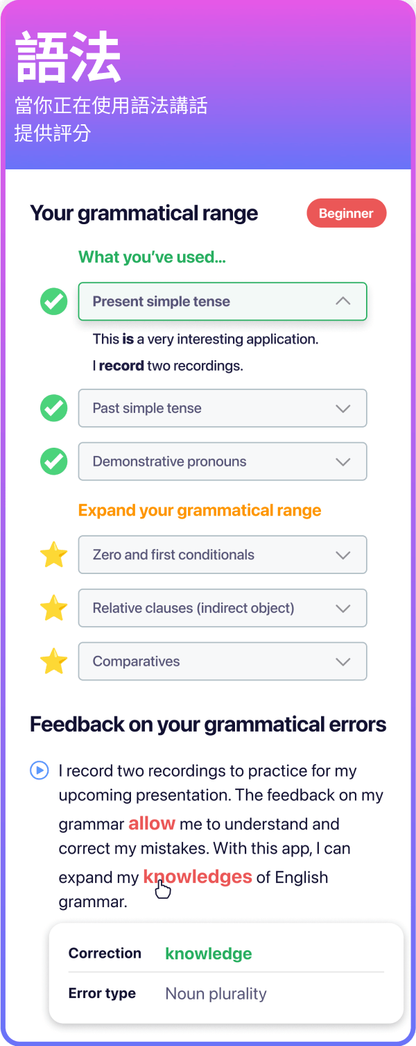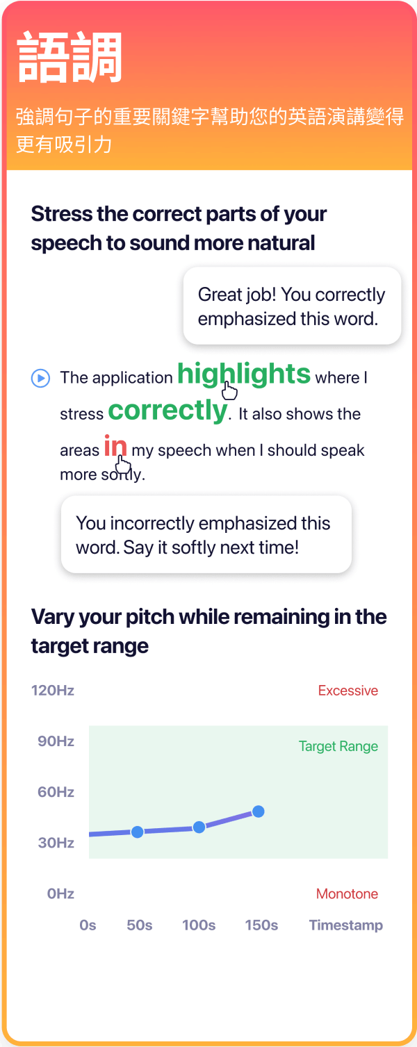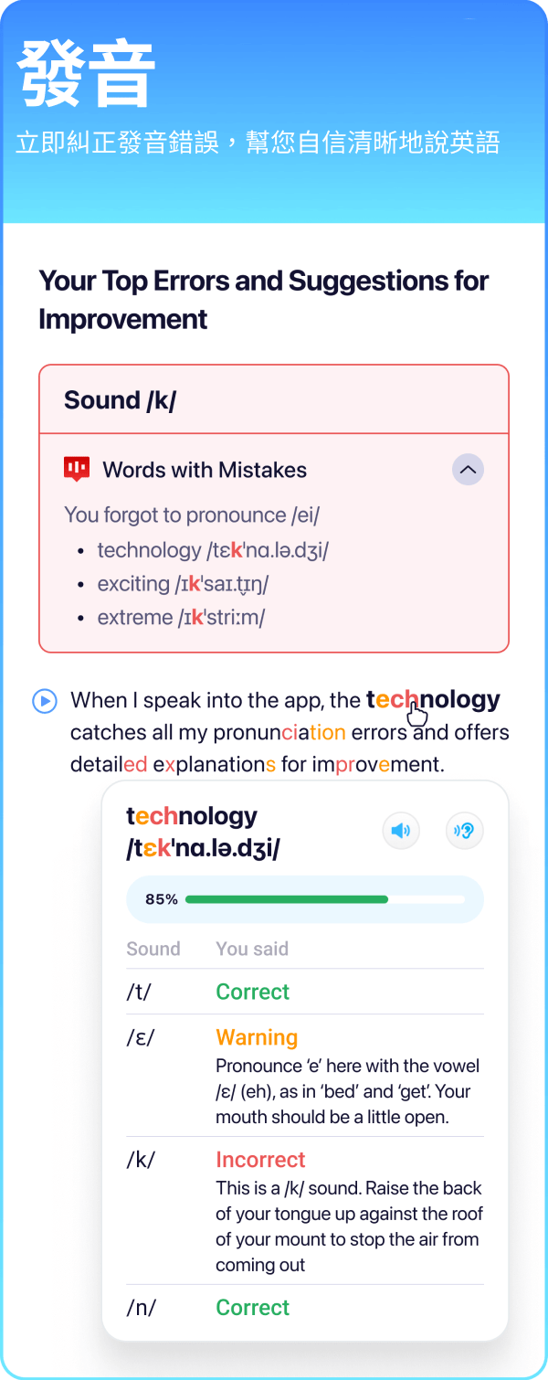 世界第五名,透過專屬AI智能技術,協助你準確糾正每一個音節的發音錯誤。