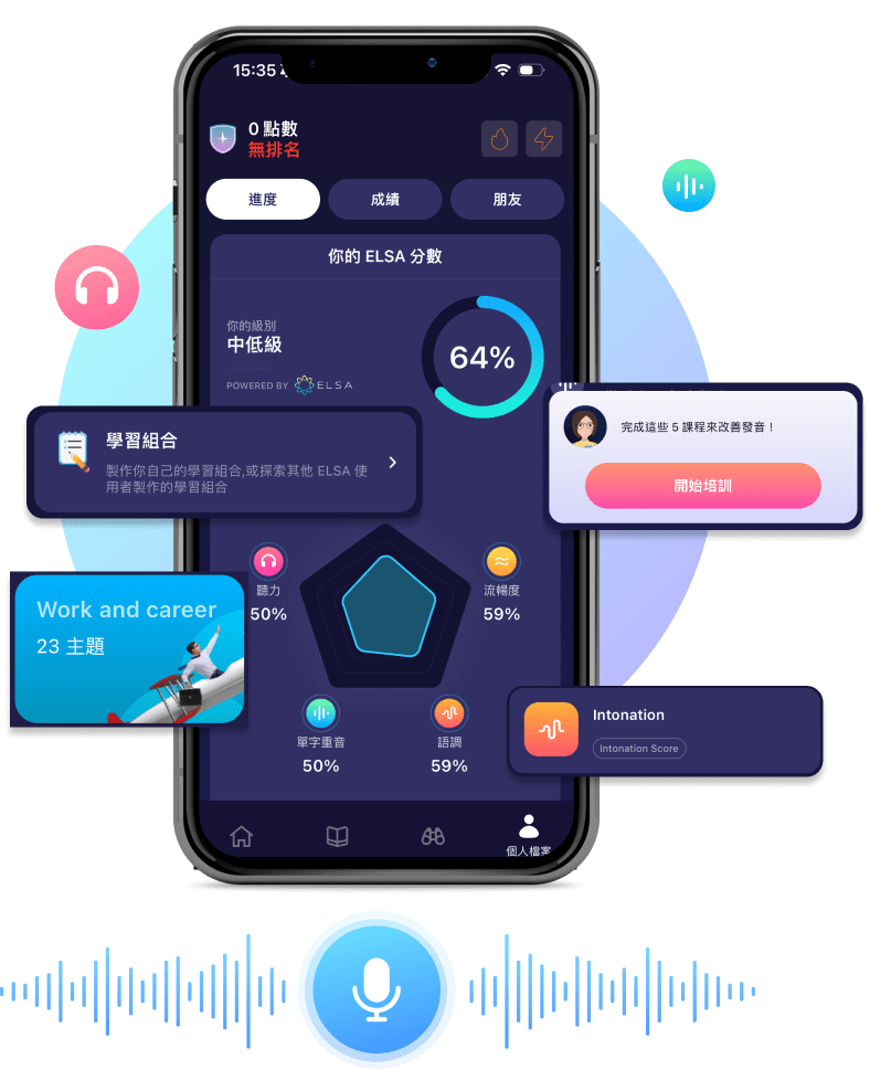 ELSA 像您個人的線上母語導師一樣與即時回饋和極其精確的指示 為你總是即時幫你練習24個小時。